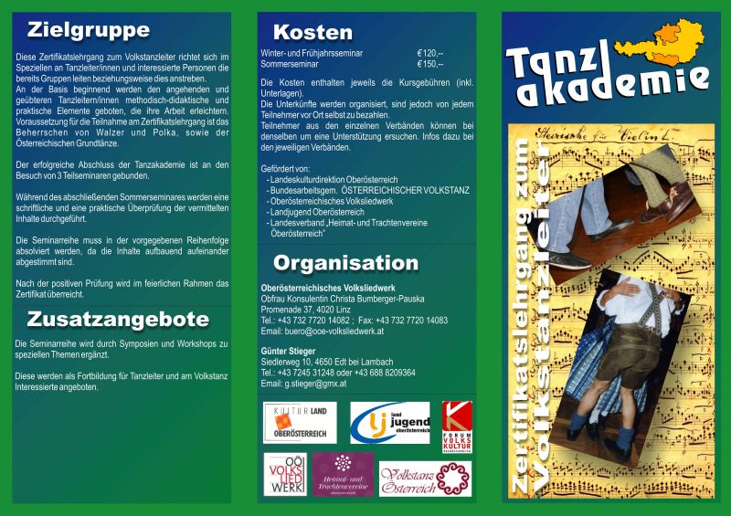 Diese Zertifikatslehrgang zum Volkstanzleiter richtet sich im Speziellen an Tanzleiter/innen und interessierte Personen die bereits Gruppen leiten beziehungsweise dies anstreben. An der Basis beginnend werden den angehenden und geübteren Tanzleitern/innen methodisch-didaktische und praktische Elemente geboten, die ihre Arbeit erleichtern. Voraussetzung für die Teilnahme am Zertifikatslehrgang ist das Beherrschen von Walzer und Polka, sowie der Österreichischen Grundtänze. Der erfolgreiche Abschluss der Tanzakademie ist an den Besuch von 3 Teilseminaren gebunden. Während des abschließenden Sommerseminares werden eine schriftliche und eine praktische Überprüfung der vermittelten Inhalte durchgeführt. Die Seminarreihe muss in der vorgegebenen Reihenfolge absolviert werden, da die Inhalte aufbauend aufeinander abgestimmt sind. Nach der positiven Prüfung wird im feierlichen Rahmen das Zertifikat überreicht.